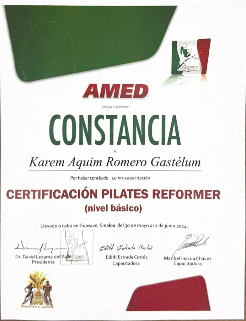 Karem Aquim Romero Gastélum concluyó satisfactoriamente la Certificación en Pilates Reformer (Nivel Básico), impartida durante 40 horas en Guasave, Sinaloa, del 30 de mayo al 2 de junio de 2024.