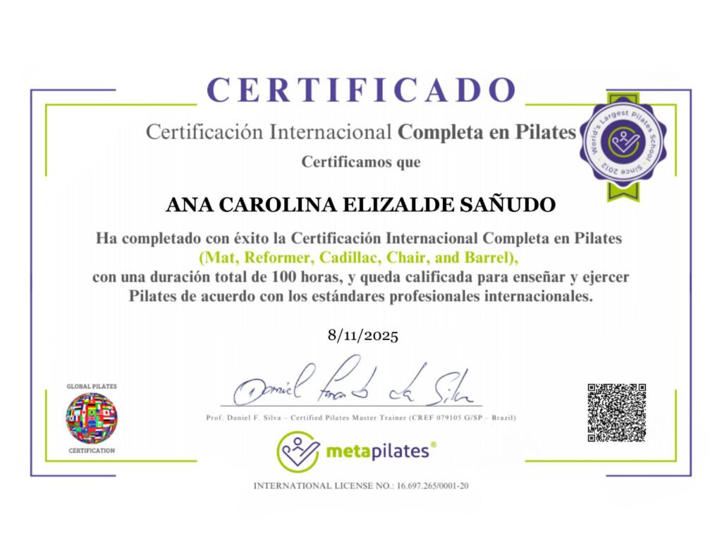 Ana Carolina Elizalde Sañudo ha completado con éxito la Certificación Internacional Completa en Pilates, cumpliendo un programa de 100 horas de formación integral en Mat, Reformer, Cadillac, Chair y Barrel.